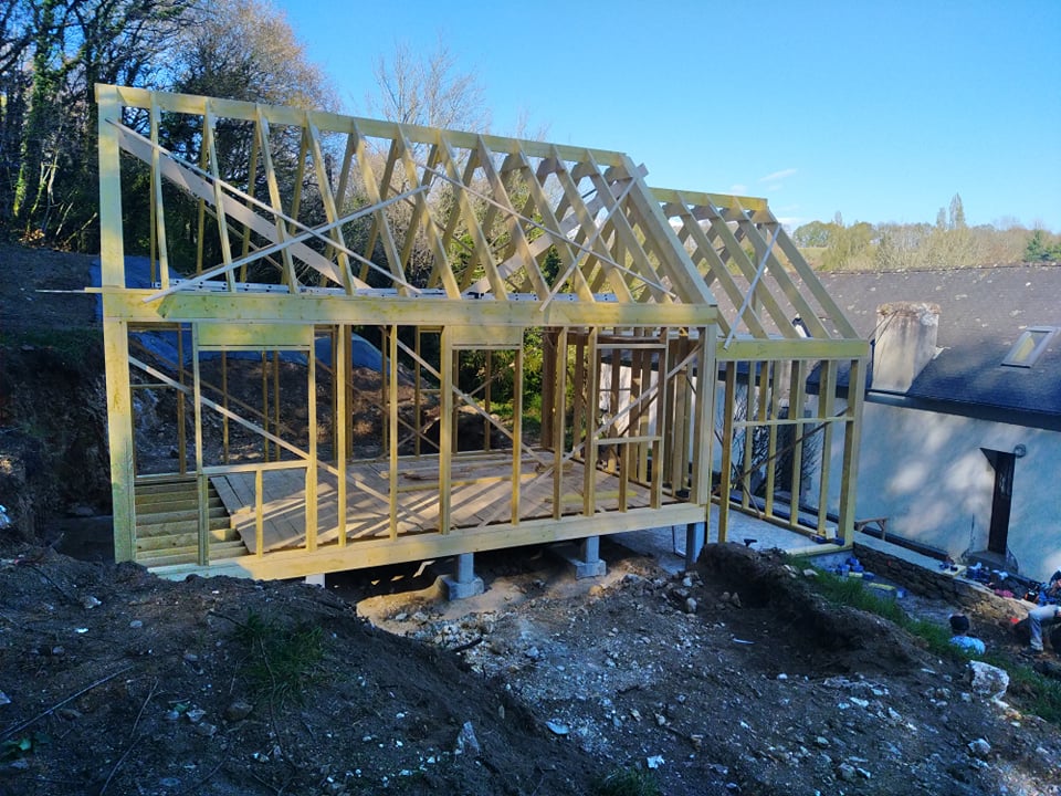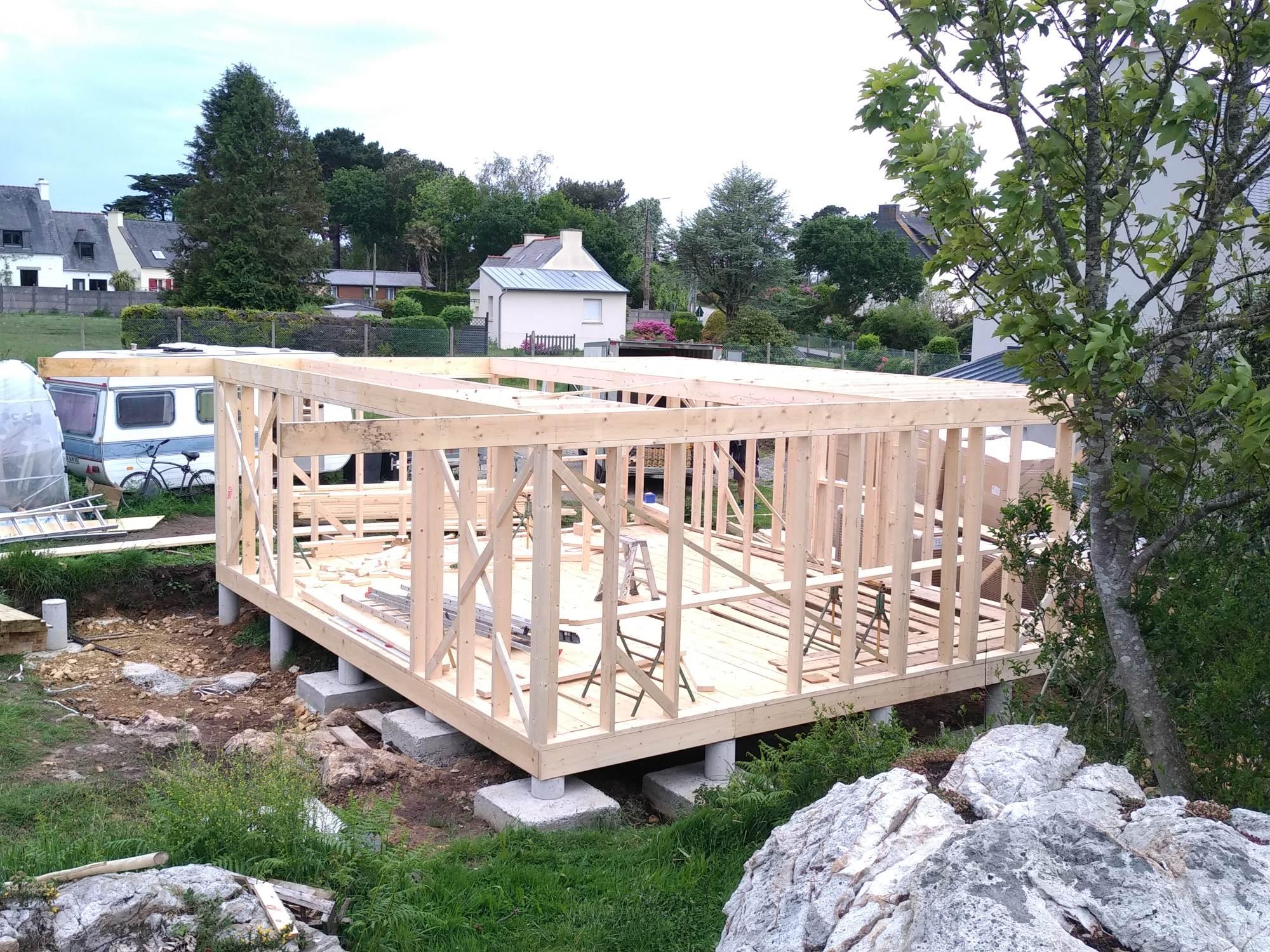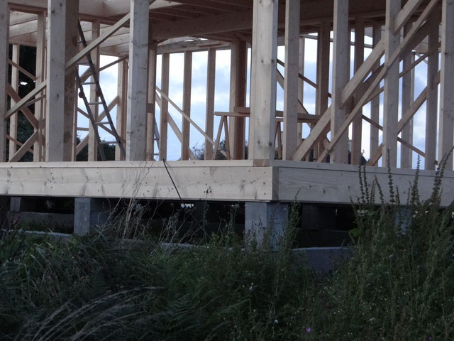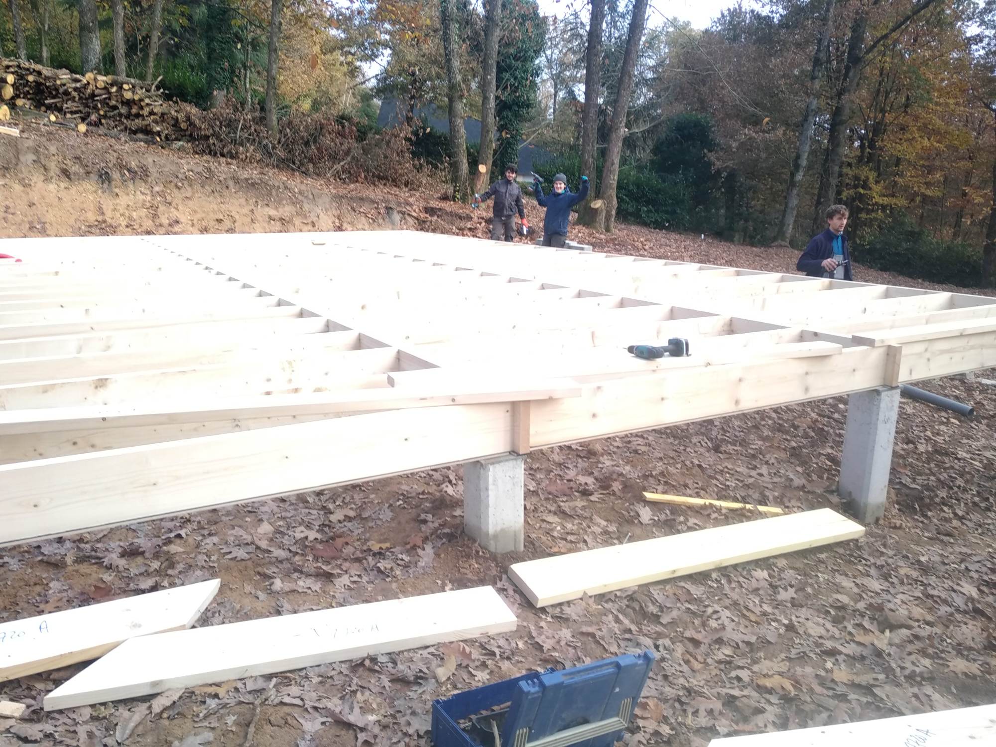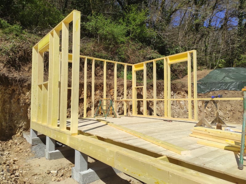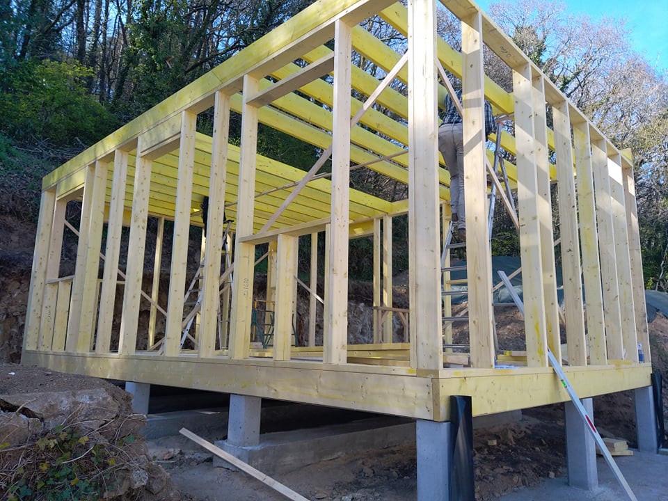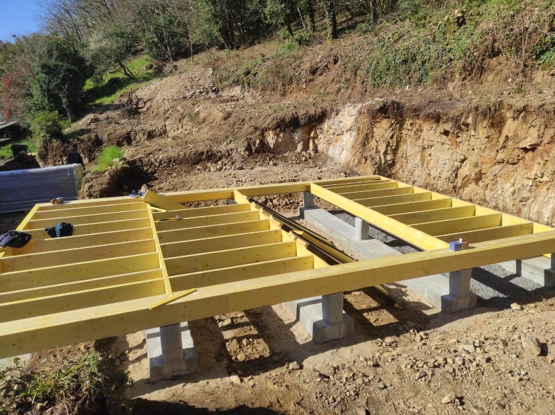 La maison sur pilotis utilise des plots en béton pour les fondations de la maison. La maison sur bois étant nettement plus légère qu’une maison « classique », ce qui lui permet de tenir sur ces pilotis. De plus, cela permet de considérablement réduire l’impact béton et surtout le coût final de votre logement.